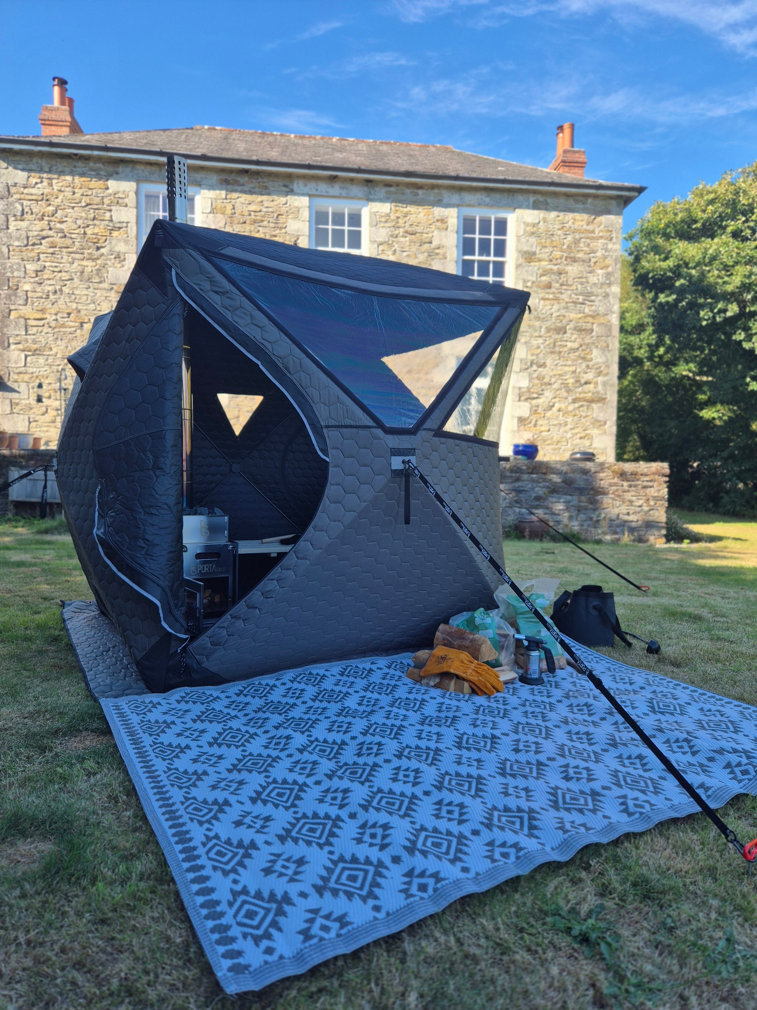 Secret Sauna Club nutzt mit Stolz die PortaSauna HEX, ein robustes, dreilagig isoliertes, holzbefeuertes Saunazelt, das für den Einsatz in der freien Natur konzipiert wurde.